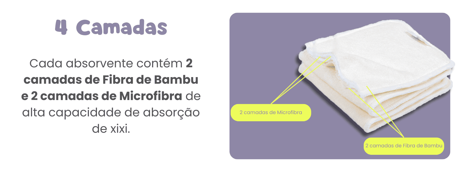 4 Camadas Cada absorvente para fraldas ecológicas Elinfant Brasil, contém 2 camadas de Fibra de Bambu e 2 camadas de Microfibra de alta capacidade de absorção de xixi. 2 camadas de Microfibra 2 camadas de Fibra de Bambu