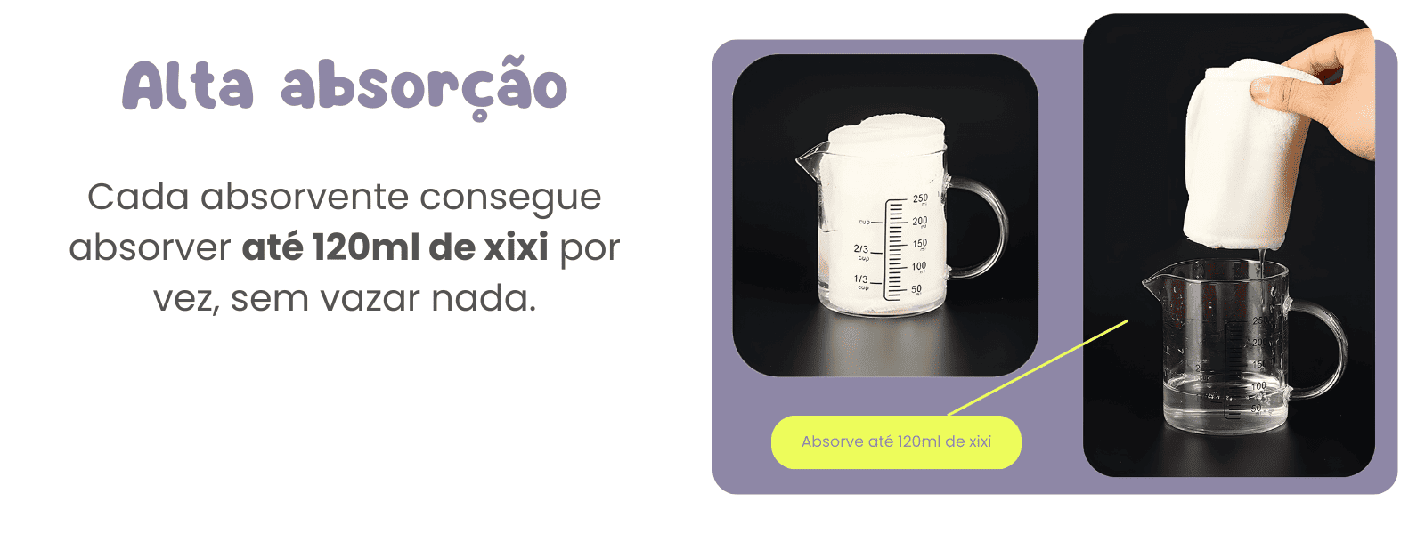 Alta absorção Cada absorvente para fraldas ecológicas Elinfant Brasil, consegue absorver até 120ml de xixi por vez, sem vazar nada. Absorve até 120ml de xixi
