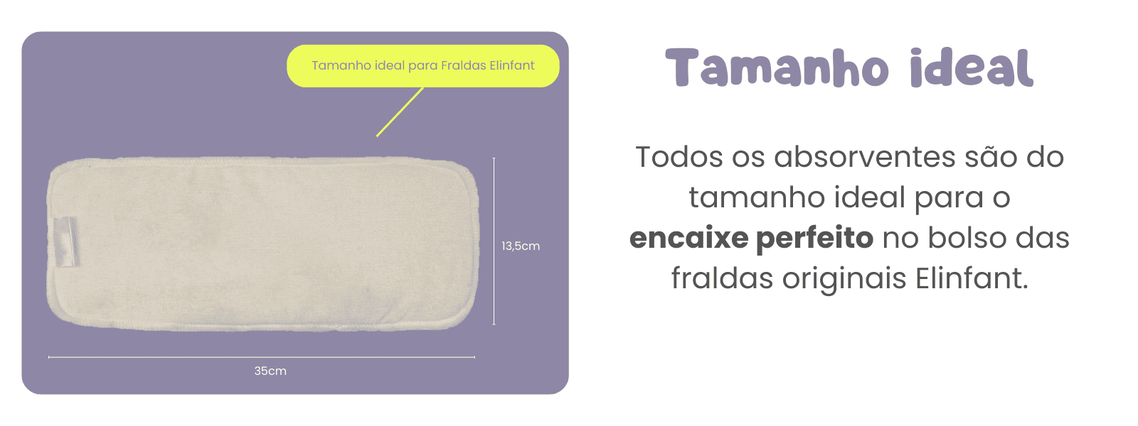 Tamanho ideal Todos os absorventes para fraldas ecológicas Elinfant Brasil, são do tamanho ideal para o encaixe perfeito no bolso das fraldas originais Elinfant. Tamanho ideal para Fraldas Elinfant 13,5cm 35cm
