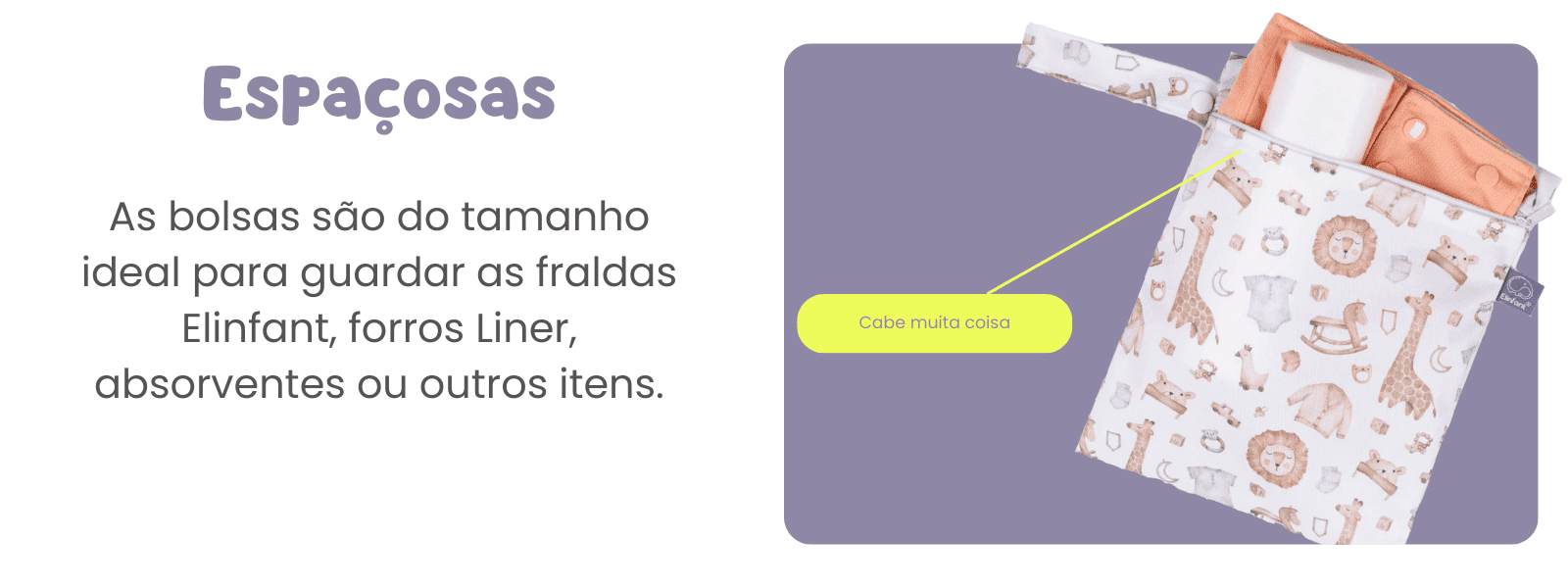 Espaçosas As bolsas são do tamanho ideal para guardar as fraldas Elinfant, forros Liner, absorventes para fraldas ecológicas Elinfant Brasil, ou outros itens. Cabe muita coisa