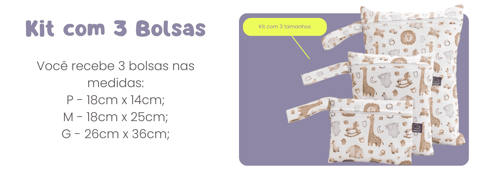 Kit com 3 Bolsas Você recebe 3 bolsas nas medidas: P – 18cm x 14cm; M – 18cm x 25cm; G – 26cm x 36cm; Kit com 3 tamanhos
