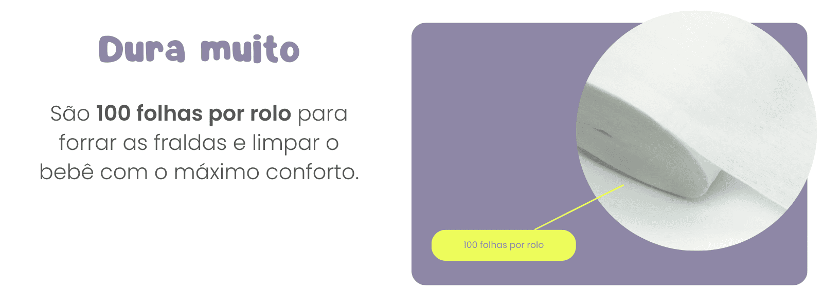 Dura muito São 100 folhas por rolo para forrar as fraldas e limpar o bebê com o máximo conforto. 100 folhas por rolo