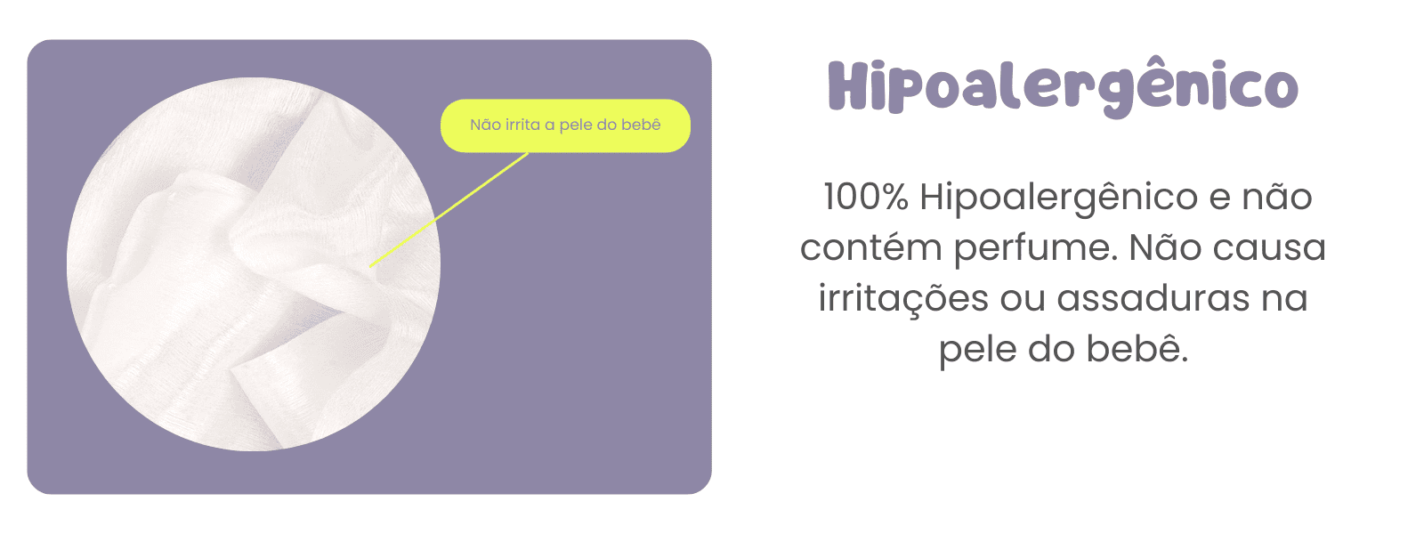 Hipoalergênico 100% Hipoalergênico e não contém perfume. Não causa irritações ou assaduras na pele do bebê. Não irrita a pele do bebê