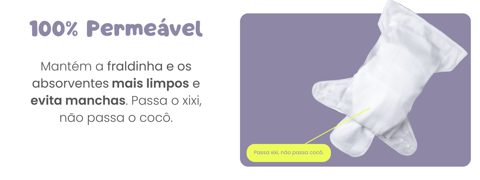 100% Permeável Mantém a fraldinha e os absorventes para fraldas ecológicas Elinfant Brasil, mais limpos e evita manchas. Passa o xixi, não passa o cocô. Passa xixi, não passa cocô.