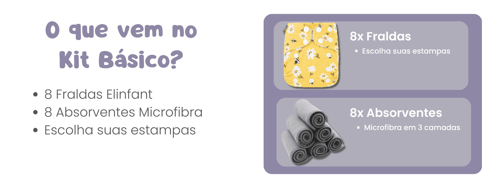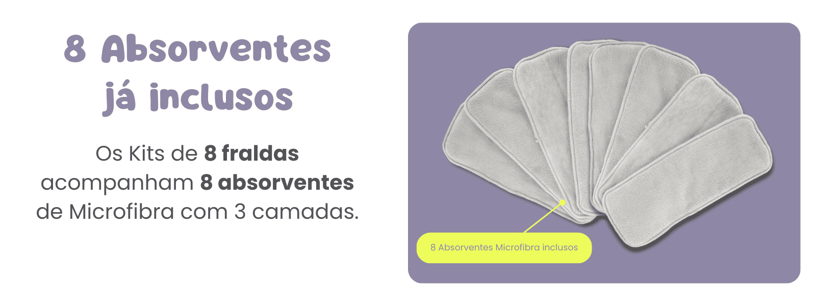 Os Kits de 8 fraldas acompanham 8 absorventes para fraldas ecológicas Elinfant Brasil, de Microfibra com 3 camadas.