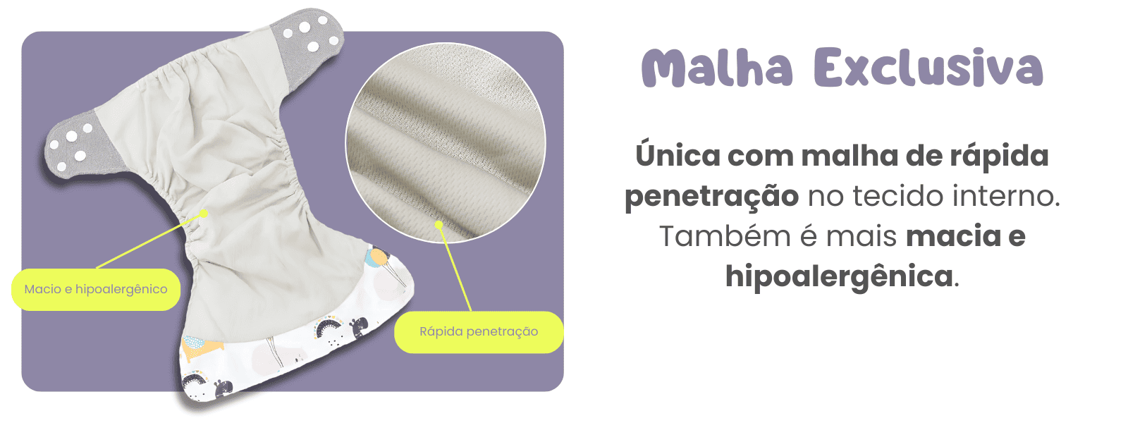 Única com malha de rápida penetração no tecido interno. Também é mais macia e hipoalergênica.