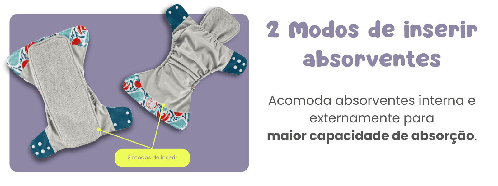 Acomoda absorventes para fraldas ecológicas Elinfant Brasil, interna e externamente para maior capacidade de absorção.