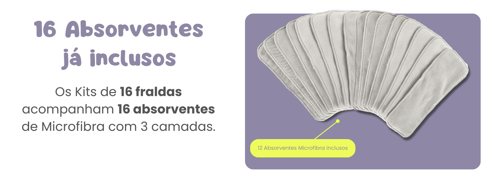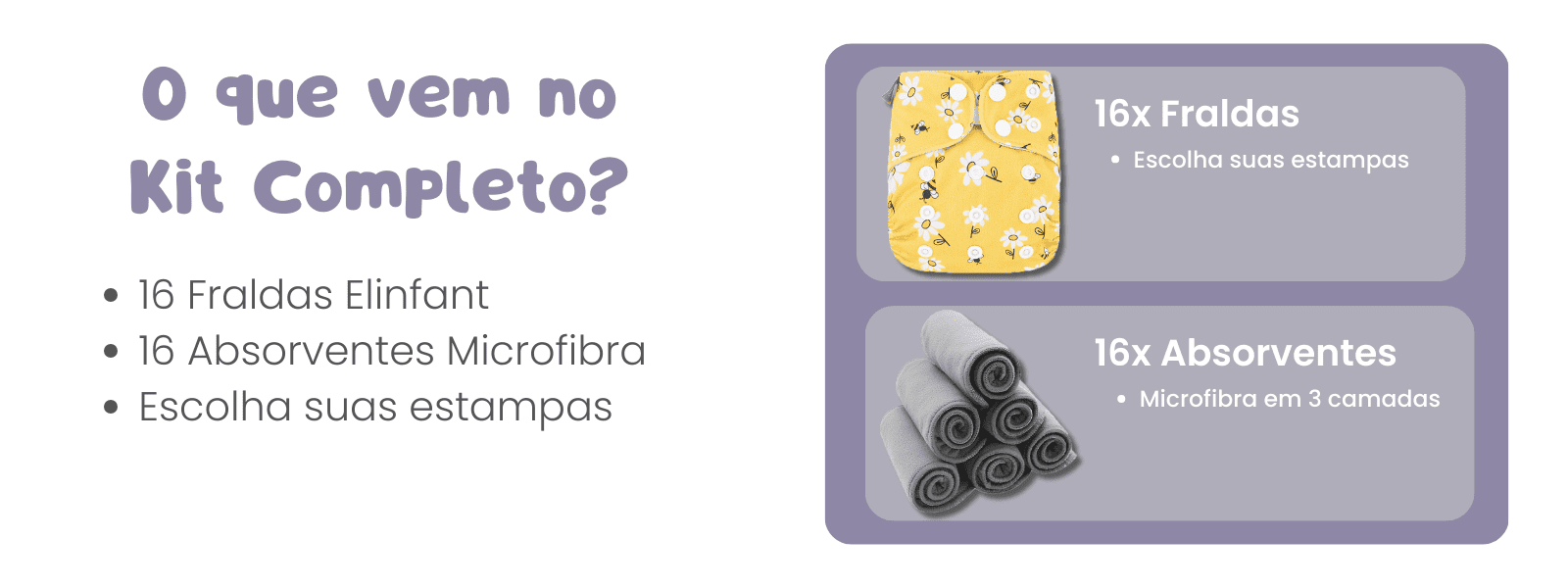 16 Absorventes para fraldas ecológicas Elinfant Brasil, já inclusos Os Kits de 16 fraldas acompanham 16 absorventes para fraldas ecológicas Elinfant Brasil, de Microfibra com 3 camadas. 12 Absorventes Microfibra inclusos