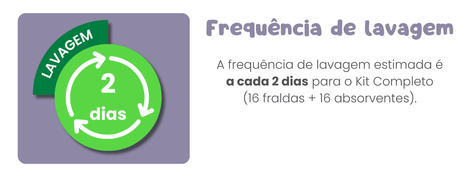 Frequência de lavagem LAVAGEM 2 dias A frequência de lavagem estimada é a cada 2 dias para o Kit Completo (16 fraldas + 16 absorventes para fraldas ecológicas Elinfant Brasil).