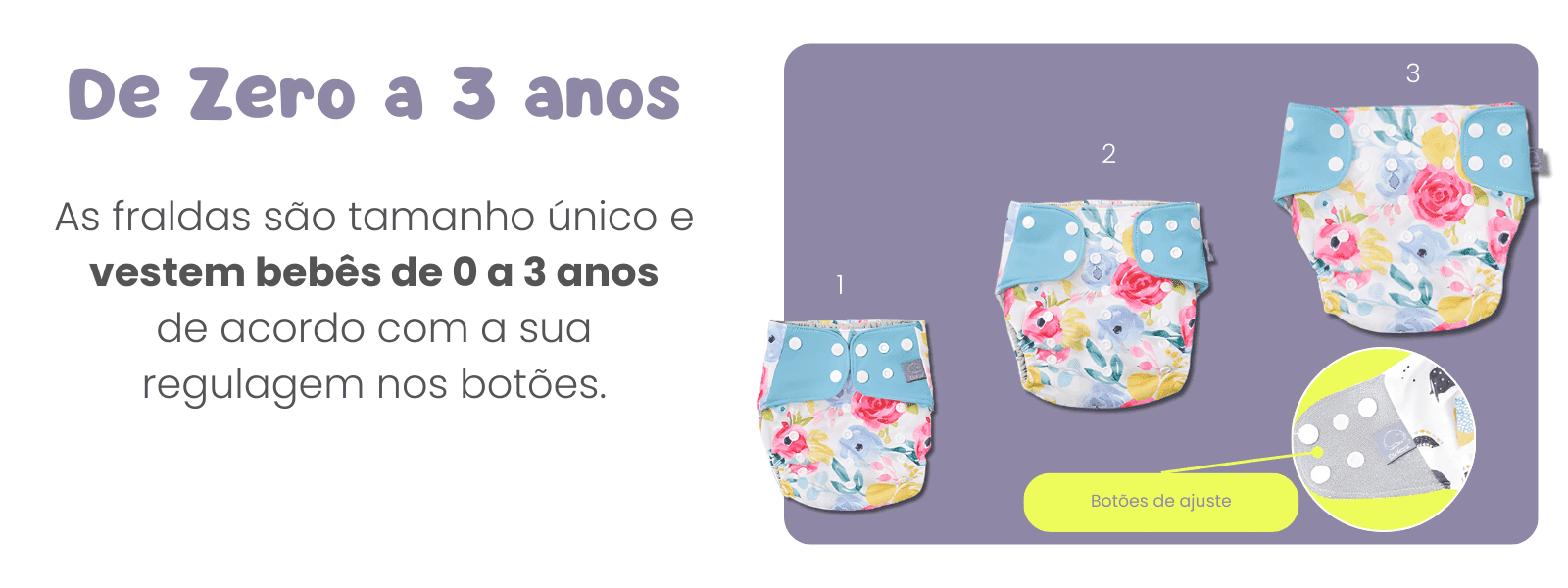 De Zero a 3 anos As fraldas são tamanho único e vestem bebês de 0 a 3 anos de acordo com a sua regulagem nos botões. Botões de ajuste