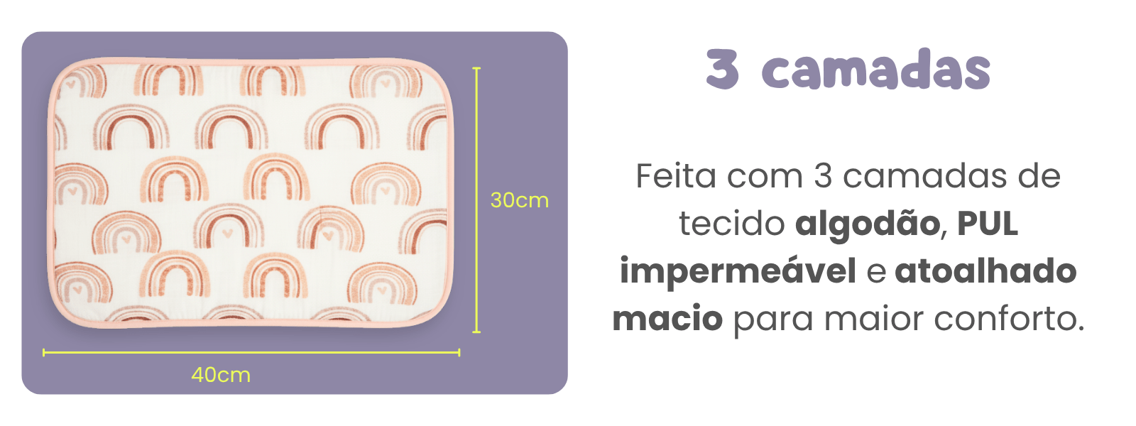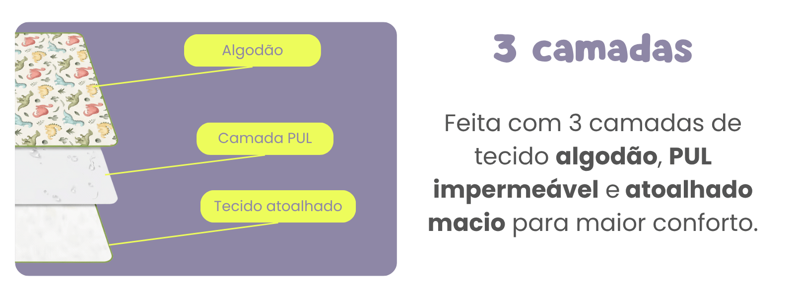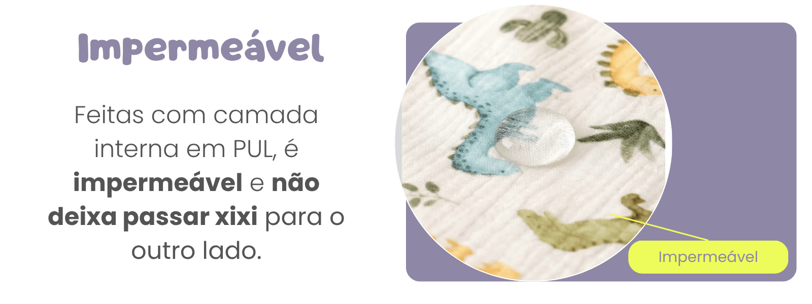 Impermeável de Verdade: Feito com uma camada interna em PUL (mesmo material das nossas fraldinhas), é impermeável e não deixa passar xixi para o outro lado para proteger superfícies.